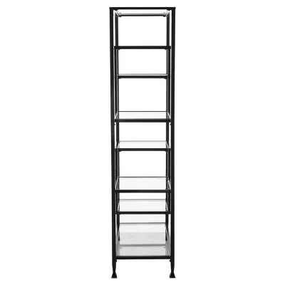 Whether you’re organizing your books or displaying your decorative items, this Jamel Bookcase from Aiden Lane will offer enough space for your items while creating a beautiful accent piece. Featuring glass shelves on a matte black metal frame, this metal and glass bookcase adds a sleek and stylish look to your space. The seven multi-sized shelves help you display all your small and large decorative pieces, framed photos and more — just place it in your living room or library to keep your space organized and attractive.