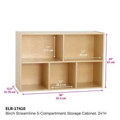 Get maximum storage in a minimal footprint with ECR4Kids 5-Compartment Birch Streamline Storage Cabinets. These durable birch hardwood storage cabinets have two large compartments and three small ones to provide plentiful storage for books, art supplies, toys and more. The attractive natural finish complements classrooms, preschools, bedrooms, daycares and homes for an all-around storage solution. Pair with ECR4kids Scoop Front Bins (ELR-0482-XX) for a colorful and convenient storage solution. Features rounded edges for safety. Adult assembly required. Birch Streamline Cabinets are GREENGUARD[GOLD] Certified for low chemical emissions into indoor air. Β With a concentration on the Pre K-12 sector, ECR4Kids offers a wide range of products including classroom tables and chairs, preschool rest time solutions, hardwood storage cases, blocks and manipulatives, mobile organizers and a variety of indoor and outdoor play structures.