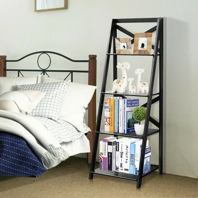 This is our 4-tier bookshelf, which is perfect to fit your bedroom, living room, home office or the kids room. Its unique leaning ladder space-saving tiered design adds stylish storage to your living space. Four graduated shelves make maximum use of your floor space. Featuring solid wood structure, it is durable and sturdy. This bookshelf will meet your widely need whether you read novels, sci fi, political thrillers or you need more room for the kids books. Do not hesitate to buy it now! Specification: Color:Black. Main Material:MDF. Overall dimension:20.0” x18.1” x 56.3”(L x W x H). Package includes:1 x Bookshelf;1 x Instruction. . .