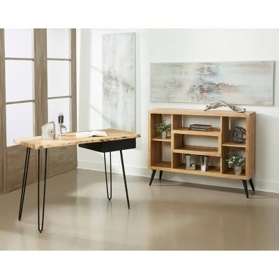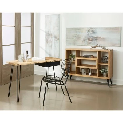 Seven open compartments plus a spacious top surface gives you a wonderful way to showcase your photographs, books and artwork on this striking Bookcase. Floating above tapered dark metal angled legs and finished in our rich Acacia Natural finish, the linear clean lined construction has a Mid-Century elegance that will never go out of style, and that will give you just that look you have been searching for!