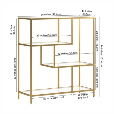 Combine functionality and on-trend design with this eye-catching and versatile bookcase. The clean lines of its steel frame instantly update any storage space, pairing perfectly with your modern home office or mid-century den. Its compact footprint makes this the perfect storage space if youβre working with a tight corner or smaller space. The geometric, staggered shelving is made of durable tempered glass, creating plenty of storage without weighing down the room visually. The four tiers allow you optimal space to display your books, pictures frames, plants and more!Features : Compact size is perfect for small spacesTabletop and shelving are made of durable tempered glassHandcrafted finish is applied to the steel frameTop and bottom shelves have a weight capacity of 30 lbs; middle shelves can support 20 lbs.Features easy assembly.Clean with a soft, dry cloth; no harsh chemicals or abrasive cleaning materials.Specifications : Product Dimensions : 36W x 14D x 40HProduct Weight : 43.21 lbs
