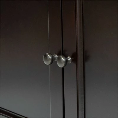 This corner bookshelf features one cabinet with two doors to store your books, magazines or personal documents. It’s crafted from solid wood and wood veneer in a dazzling espresso finish that matches most decor. The two open shelves will display your dΓ©cor while the solid contemporary structure ensures lasting style.Features : Includes: One (1) Corner BookshelfStyle: ContemporaryFinish: EspressoMaterials: Solid Wood, Wood Veneer, MDFTwo (2) open shelvesOne (1) large storage cabinetSpace saving corner designEasy to follow step by step assembly guide includedSpecifications : Product Dimensions : 32″W x 17″D x 50″HProduct Weight : 62 lbsWeight Capacity : 80 lbsAssembly Required : YesWarranty Description : 90-Day Manufacture Limited Replacement Parts Warranty
