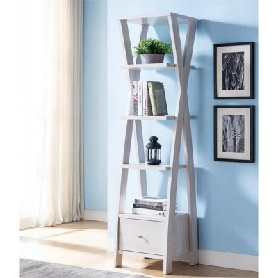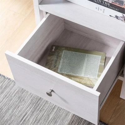 Increase your home’s storage options while adding a modern-inspired style with this upright white oak bookshelf tower. 1-lower drawer offers room for storing magazines or CDs and the 4 open shelves allow you to display your collection of books or family photographs. Bring this wood bookcase to your home for endless ways to display your favorite items.Features : OPEN SPACE CONCEPT – 360Β° finished frame gives this item versatility to be placed in different positions off the wall.Includes: One (1) BookcaseStyle: ModernFinish: White OakMaterials: MDF, Particle Board, Steel HardwareFour (4) spacious shelvesStrong sturdy legsOne (1) drawer on metal glidesSpot wipe and cleanEasy to follow step by step assembly guide includedSpecifications : Product Dimensions : 17.5″W x 15.5″D x 71″HProduct Weight : 58 lbsWeight Capacity : 40 lbsAssembly Required : YesWarranty Description : 90-Day Manufacture Limited Replacement Parts Warranty