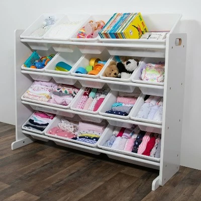 Playtime becomes more fun when your kids can easily take out their toys, books and games and then quickly clean up afterwards. The space-saving Humble Crew Super Sized Toy Storage Organizer with 16 Storage Bins stows your children’s toys in easy-to-see, easy-to-access BPA and phthalate free plastic storage bins. Ideal for organizing your childβs nursery/bedroom, playroom, closet, living room….the options are endless! The 12 standard and 4 large colorful storage containers are easy to remove, replace and reposition along the 4 tiered organizer shelves. Storage bins are sized just right within the toy organizer for toddler and preschool aged children. Sturdy engineered wood construction frame with stabilizing braces and steel shelving rods, 20 pound weight capacity per level. Some assembly is required. A great toy storage box alternative; helping keep your little oneβs room clean and organized while at the same time teaching color identification, sorting and cognitive skills.