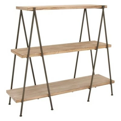 - This wooden shelf features 3-tiers of spacious ledges held securely by metal frames