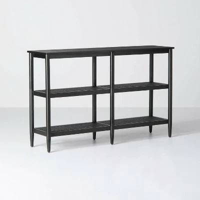 Organize your favorite books and other items in style with this Wood & Cane Short Console Bookshelf from Hearth & Hand™ with Magnolia. Crafted from solid wood in a black finish for a stylish look, this console bookshelf comes with open cane shelves, making it easy to fit your favorite books and possessions while adding a functional and decorative touch to your room. The spacious tabletop provides the perfect place to showcase potted plants, collected curios or framed photos — making it the perfect piece for any area of your home.