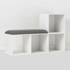 - Six cubby spaces designed to store home and office supplies or display decorative accents