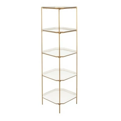 This classic 5-tier étagère features a fresh contemporary twist with it posh white shelves. A design investment, its fine iron construction features a luxurious brass finish that frames its layers of ample open storage. The generous space provided by these shelves can stylishly showcases any personal belongings you treasure, such as books, flowers, photo frames and more. with a weight capacity of fifty pounds, feel free to display all the items you desire. Designers love to use them in pairs.