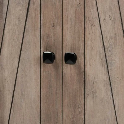 Crisp lines create a sleek silhouette in the stunning Derek bookcase. Made in Malaysia, the Derek is constructed from sturdy wood showcasing a natural oak finish. Three external shelves provide an excellent display for books or decorations, while two internal shelves supply concealed storage space. Requiring assembly, the doors feature an exquisitely carved design, as well as black finished square metal knobs for added visual appeal. A stylish way to organize and display collections, the Derek bookcase is an excellent addition to any space.